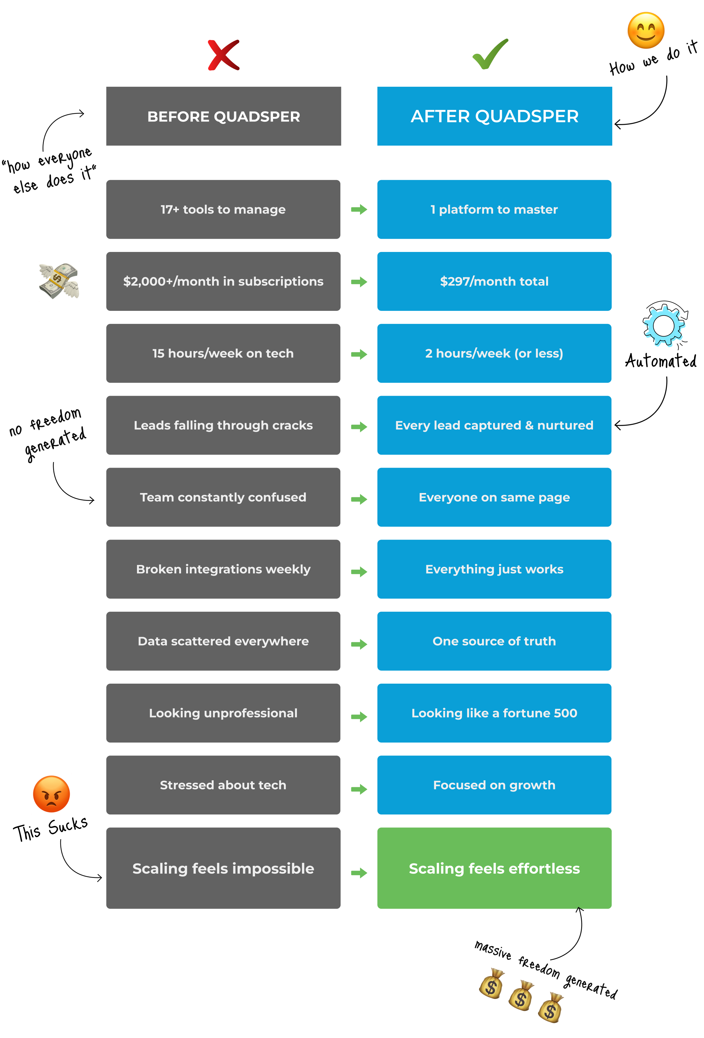 You're juggling 15+ subscriptions. Leads are slipping through the cracks. Your team is confused. Your clients are frustrated. And you're spending 10+ hours a week just trying to
